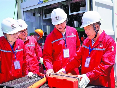 ▲集团公司首席专家王延光(右一)到中国石化首个自主采集处理的OBN项目——埕岛三维项目的放缆船上,了解OBN施工、数据处理流程及项目针对OBN节点新装备、新工艺采取的安全、质量管控措施。张广虎 摄