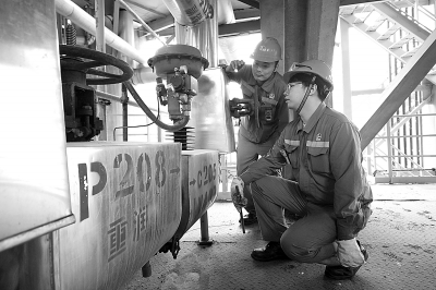 日前,高桥石化润滑油加氢装置生产的280吨优质HVIⅢ4基础油顺利取得产品质量合格证,标志着从常规侧线生产高黏度润滑油的技术获得成功。高桥石化克服以往产品黏度波动大、蒸发损失波动大等难题,创新工艺形成这一技术,并申请了国内实用新型专利。图为10月9日,装置技术人员应用新技术调整工艺流程与现场生产工况。徐峥辉 摄