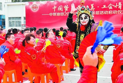 10月8日,“中国梦·劳动美·工会情”中原油田2023年文化进基层系列演出活动在地面工程抢维修中心广场拉开帷幕,为一线的干部职工送上了一份“文艺大餐”。 舞蹈、歌曲、诗朗诵、魔术等精彩纷呈的节目,赢得了观众热烈掌声。此次文化进基层慰问演出活动将在油田基层及外部市场中原队伍所在地巡回开展。图为演员表演川剧变脸,近距离与员工互动。仝 江 摄