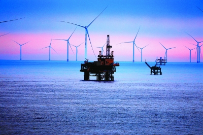 蔚蓝海面上,胜利油田海上作业平台与不远处的“大风车”相依相伴,共同谱写美好的能源协奏曲。胜利油田 张 灿