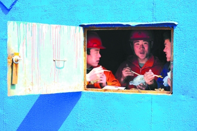 火热的石化建设工地上,无数工人挥洒汗水。午餐时间,他们在简易工棚内就餐。饭菜是那么简简单单,但青春的热情洋溢在脸上。镇海炼化 傅纯平