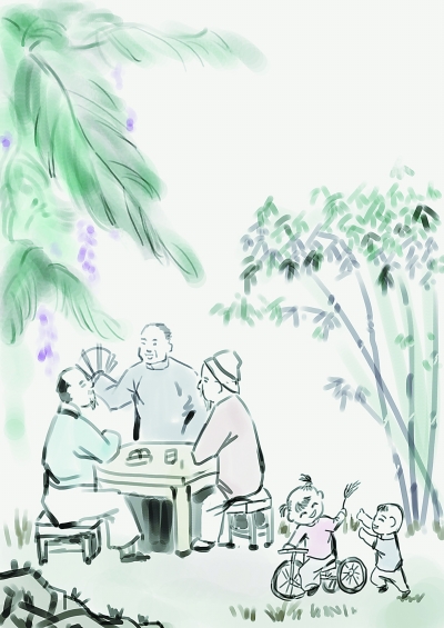 于清波 一队孩童骑车转 一组老人乘凉谈 一架紫藤隔暑热 一片竹林赏心田 图片 吴 迪 绘图