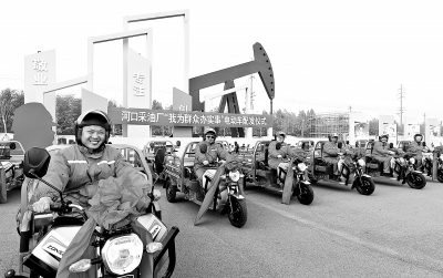胜利油田河口采油厂将更多资源向基层一线倾斜,解决员工“急难愁盼”问题。11月22日,该厂举行电动车配发仪式,120辆崭新电动三轮车发放给一线员工,解决员工巡检难问题。图为员工们兴高采烈地驾驶着电动车出发。 吴木水 摄 丁 洁 文