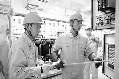 入冬以来,齐鲁石化热电厂针对电气设备操作频繁的实际,强化落实“手指口述”,切实保障作业安全。图为12月8日,该厂电气二车间运行人员在配电室执行送电操作。 苏成武 摄