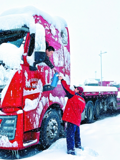 -26℃ 12月12日,新疆伊犁突降大雪,气温降至零下26摄氏度。由于路面结冰严重,果子沟山路封堵。伊犁石油果子沟加油站员工为滞留在路上的货车司机送去开水和食物。毛 杰 摄