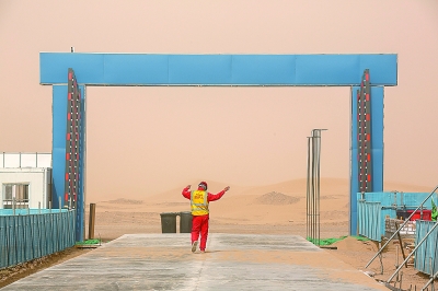 3月的大漠,沙尘暴是常客。在西北油田顺北油气田10亿立方米天然气处理厂建设现场,数百名建设者与大漠为伴,已经在这里工作生活了大半年。 一名施工监护缓步走出基地大门。他随着自己的节奏摆动着上肢,几分悠闲、几分洒脱,似乎毫不在意空中的沙尘,而是沉浸在自己的快乐中。 金 戈 摄