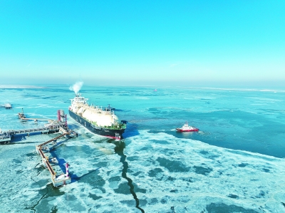 供暖季以来,天然气分公司天津LNG接收站保持“三天两船”的接卸频次,日均气化外输量达3000万立方米。截至1月3日,投产以来累计外输天然气超400亿立方米,有力保障华北地区天然气安全平稳供应。图为液化天然气运输船靠泊接收站码头。 王 军 摄