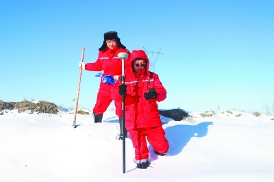 | 物探队员在漫天雪地里做节点仪试验线放样工作。 |