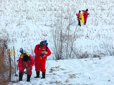 | 积雪太厚,测量员手持工具艰难行走在雪原上。 |