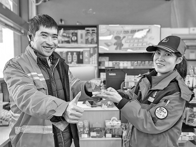 近日,贵州贵阳气温降至零下,贵阳石油息烽城关加能站员工备好了水果茶,为寒冬中的环卫工人送上温暖。图为环卫工人为息烽城关加能站员工的热情服务点赞。 陈飞飞 摄