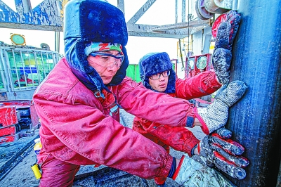 西北油田采油三厂全力保障TKK3-2-4H天然气新井产能建设,做好今冬明春天然气保供工作。图为员工进行起下钻井管柱作业。石立斌 摄