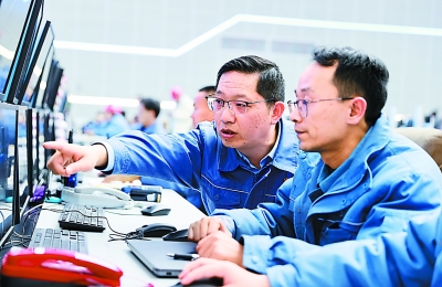1月3日,湖南石化实现一体化运营,近60套装置安稳运行。年产60万吨己内酰胺产业链搬迁升级项目新建煤气化装置技术人员加强协调协作,深度优化生产。图为1月16日,新区己内酰胺部中央控制室内,技术人员在交流优化操作调整事项。彭 展 摄