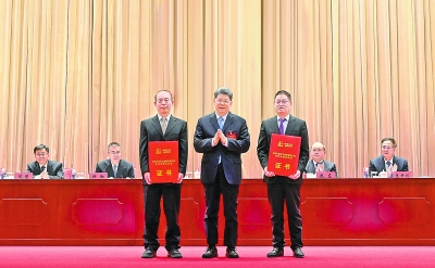 1月26日,集团公司董事长、党组书记马永生为集团公司首席专家、石油勘探开发研究院计秉玉(前排左),工程建设公司副总工程师李凤奇(前排右)颁发2023年度中国石化科技创新功勋奖证书。本报记者 程 阳 闫坪卉 摄影报道