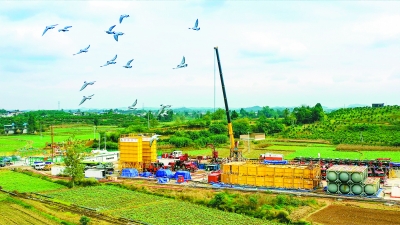 近日,由西南油气分公司提交的位于四川盆地的合兴场气田1330.12亿立方米探明地质储量通过自然资源部专家组审定,标志着我国又一个超深层、整装致密砂岩千亿立方米大气田诞生,中国石化“深地工程·川渝天然气基地”再获突破。 合兴场气田位于四川省德阳市和绵阳市,属于深层、高压、特低孔致密砂岩气,效益开发属于世界级难题。中国石化几代地质工作者不断突破瓶颈,特别是2018年以来,依托集团公司重大科技攻关项目,多学科协同攻关,创新形成超深层致密砂岩气富集规律及效益开发技术体系,实现老层系新领域的突破,使难动用储量的高效动用成为现实。图为合兴场气田新盛201平台施工现场。刘淑石 图 张勇林 薛 婧 文
