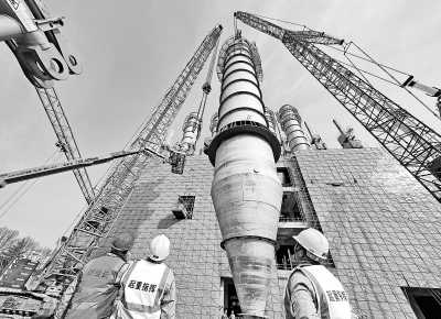 1月29日,仪征化纤50万吨/年新一代瓶片改造项目的最后一台大型设备脱醛塔吊装就位,标志着该项目大型设备吊装完成,进入管道施工安装阶段。该项目被列为江苏省重大项目,包括50万吨/年聚合单元、脱醛单元、打包及中转车间等。吊装采用450吨级履带吊为主吊、300吨级履带吊为辅吊,实现高40米、重113吨的脱醛塔平稳安装。图为脱醛塔吊装现场。 刘玉福 摄 石 惟 文