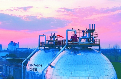 春节期间,华东油气分公司CCUS调峰中心全力保障油田二氧化碳压裂驱油所需液碳。图为2月13日正月初四,CCUS调峰中心员工巡检二氧化碳储气罐。 本报记者 沈志军 摄 程国宏 文