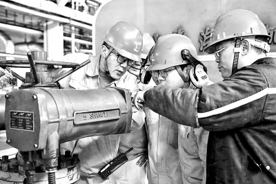 近日,上海石化热电部汽机联合装置开展调节阀实操培训,明确操作方法,推动调节阀手动切换操作步骤规范化、标准化。图为热电部员工参加调节阀手动切换实操培训。 严雪明 摄