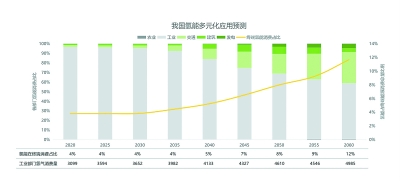 绿氢有望于2030~2035年迈过经济性“拐点” 2023年,我国氢气供应量3541万吨,其中,煤制氢占比64.6%、电解水制氢占比不足0.5%。随着碳排放约束的增强和电解水制氢经济性的提升,我国化石能源制氢将于“十五五”期间达峰并下行,电解水制氢将于2030年前后开启规模化发展阶段。预计到2060年,我国氢气供应量增至8580万吨,其中煤制蓝氢和天然气制蓝氢占比7%、电解水制氢占比89.5%,制氢耗能占我国一次能源消费总量的18%。 近中期,灰氢是我国的主导氢源,技术成熟,价格低廉,但制氢直接碳排放约占我国能源活动碳排放总量的4%。当前,我国煤制灰氢和天然气制灰氢规模约2800万吨,处在峰值平台期,占氢气供应总量的78%左右。预计2030年后,在碳排放约束政策下,碳排放成本升高推动灰氢成本加速上涨,使得灰氢市场竞争力减弱、供应逐步萎缩,到2060年基本退出。 展望远期,绿氢将成为我国的主导氢源,并在氢气供应低碳化、能源消费低碳化进程中发挥关键作用。在电解水制氢技术升级、智能化制造和可再生能源发电降本共同作用下,我国绿氢有望于2030~2035年迈过经济性“拐点”,进入规模化发展阶段。预计我国绿氢供应量将于2030年增至300万吨,于2035年达到1188万吨,于2040~2045年突破3000万吨,正式成为我国主导氢源(占专门制氢50%以上),于2060年达到7680万吨。 蓝氢是我国氢源低碳化的重要补充,将于2030年后提速发展。尽管蓝氢发展有其特定适用场景,但是整体来看蓝氢经济性在近中期不及灰氢、远期不及绿氢,使得蓝氢产业规模扩张存在局限。 氢气是一种二次、甚至三次能源,氢能和可再生能源的渗透推广将深度重构我国能源供给与利用模式。 应用场景趋于多元化,2060年消费总量增至8580万吨 展望未来的氢能社会,氢能将扮演燃料、原料、储能介质等多重角色,广泛深度地参与工业、交通、建筑、发电等部门的碳中和进程。预计2060年,我国氢能消费规模达8580万吨,占我国终端能源消费总量近12%。 我国氢能消费增长历程可以划分为三大阶段: 示范发展阶段(当前至2035年)。在此期间,氢能交通、绿氢炼化、氢冶金等应用场景尚不具备经济规模,95%以上的氢气仍用于工业领域。预计这一阶段我国氢能消费规模增长缓慢,年均增速在1.5%左右;氢能消费规模增幅有限,增至4264万吨,较当前增长23%左右。 快速推广阶段(2036~2050年)。在此期间,预计我国氢能消费量约6790万吨。尽管工业部门仍将占据氢能消费量的2/3左右,但氢能应用场景从以炼油化工为主向冶金、水泥、玻璃、陶瓷等场景推广,并在交通、建筑等领域实现规模化应用。预计氢能占我国终端能源消费总量的比重将从4.5%增至8%。 多元应用阶段(2051~2060年)。我国能源转型进入碳达峰收官阶段,“燃料”将与“原料”并列成为氢能的最主要用途,预计我国氢能消费规模将再扩张26%左右。氢能的多元化应用主要体现在3个层面:一是作为一种平价的零碳燃料,广泛用于工业领域,提供高品位热;二是氢能以甲醇、氨等氢基燃料的形式,助力航空、水运等行业深度脱碳;三是氢储能和氢发电将成为确保我国电力系统安全稳定的重要一环。