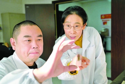 刘晨(左)与技术人员一起检验岩芯薄片。
