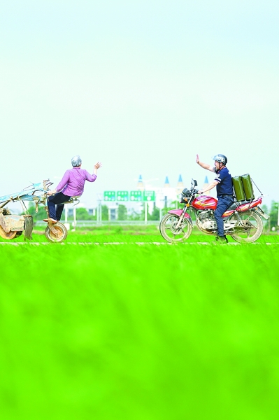 春风拂过农田,绿意盎然,生机勃发。田间有勤劳的村民,还有广东江门石油送油下乡的员工。两人相遇入诗画,和风细雨中播撒着希望。张凤娇 摄