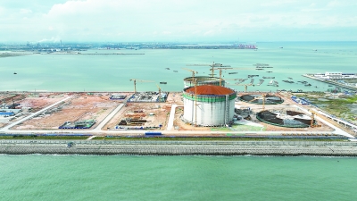 5月27日,位于广西北海、由十建公司承建的天然气分公司广西LNG三期工程首座储罐完成气顶升作业。该储罐罐容22万立方米,拱顶结构跨度长达88米、重约945吨,经过近3个小时操作,成功升顶,标志着外罐主体结构基本完成,即将开始内罐施工。图为施工现场。 苑天舒 摄 王卓然 文