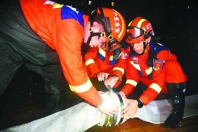 7月17日,国家危险化学品应急救援中原油田队(中原油田应急救援中心)接到河南省应急管理厅指令,从湖南平江县转战支援河南商丘市排涝抢险。图为队员在铺设水带,准备排涝。魏园军 摄