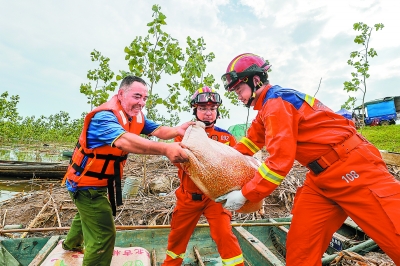 7月9日,国家危险化学品应急救援武汉石化队抵达湖南平江县增援抢险救灾工作。除了抽排积水,救援队还主动承担为村民转运饲料等工作,安全转运饲料2000余公斤,保障排涝运粮两不误。付 松 摄