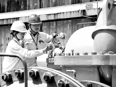 近日,扬子石化水厂炼油水务车间机泵更新完毕,这一公司绿色节能重点项目开始运行。该项目通过更换6台循环水高效节能泵、新增2台管道增压泵,大幅降低系统能耗,预计每年节约电费超300万元。图为8月8日技术人员检测节能泵运行状态。门圣卿 摄 陶 炎 文