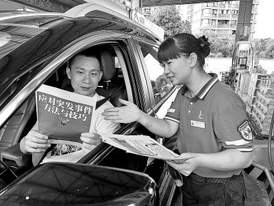 近期雨水频发,浙江台州石油组织普法宣传员向顾客宣传《中华人民共和国突发事件应对法》等法律法规,提高市民应对突发事件能力。图为8月13日,水云塘加能站普法宣传员向顾客介绍应对突发事件方法与技巧。蒋修飞 摄