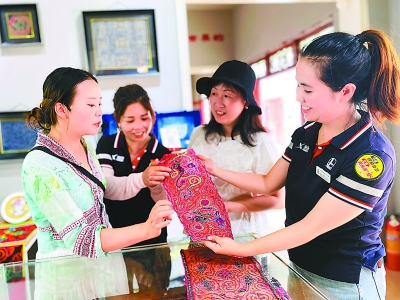 贵州贵阳石油白云分公司员工参观黔西苗族蜡染基地,积极帮助推荐和销售蜡染制品,传播蜡染文化,受到苗族乡亲的一致好评。夏冬梅 摄