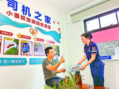 ●名 称: 贵阳石油息烽小寨坝综合加能站 ●坐 标: 贵州省贵阳市息烽县小寨坝镇 ●特 色: 集“司机之家”“爱心驿站”于一体的综合加能站 □陈飞飞/文 韩福英/图 吃口热乎饭、歇歇脚、洗个热水澡……这些看似稀松平常的事,对长年奔波在外的货车司机来说却是一种奢望。为解决他们“吃饭难、喝水难、休息难、如厕难”等急难愁盼问题, 贵州贵阳石油建设了集“司机之家”“爱心驿站”于一体的综合加能站。 该站位于贵阳市息烽县小寨坝镇,是贵阳石油息烽公司首座集加油、购物、洗车、“司机之家”“爱心驿站”于一体的综合加能站,占地面积1805平方米,有4台加油机12把加油枪,可加注92号、95号汽油和0号柴油,配备1台全自动洗车机,每年服务货车司机、户外劳动者两万余人次。站内免费提供休息室、淋浴间、洗衣机、小厨房、手机充电、续水、轮胎充气、小药箱、简易维修工具等“14+X”暖心服务。 “我们长年在外跑长途,饭菜总是吃不惯,有了‘司机之家’提供的小厨房实在太好了,我也能自己掌勺做出家乡的味道。”来自四川的货车司机王师傅开心地说。 “每次跑长途经过这里,我都会进来休息一会儿,这里有空调、热水、免费WIFI,还能洗衣服、洗澡,环境干净整洁,员工服务周到,有家的温暖。”货车司机杨师傅感慨。 “自加能站建成以来,这里24小时开放,很受货车司机欢迎。”站经理韩福英说。 小寨坝综合加能站用心用情为广大货车司机等户外劳动者提供便捷贴心服务,受到地方政府和社会公众广泛好评,2023年荣获“贵州省城区户外劳动者综合服务站省级示范点”称号。