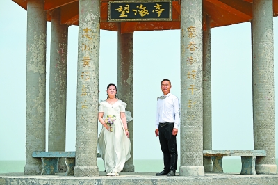 在望海亭下,苟美梅身穿洁白的婚纱与丈夫付景春相依相伴。
