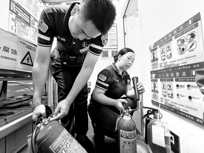 9月12日,贵州黔东南黎平石油组织开展安全大检查,对加油枪、储油设备、消防设备、电气系统和食品安全等进行检查,及时发现并消除加油站安全隐患,确保加油站安全运营。图为黎阳加油站员工在检查消防器材。 曾 冀 摄 钟 磊 文