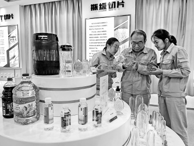 9月24日,仪征化纤为化妆品、医药、食品及家电等高端包装领域开发的BG805与BG8062款聚酯新材料实现工业化生产,进一步拓宽该公司聚酯产品应用领域,成为新的效益增长点。图为仪征化纤员工检查产品质量。刘玉福 摄