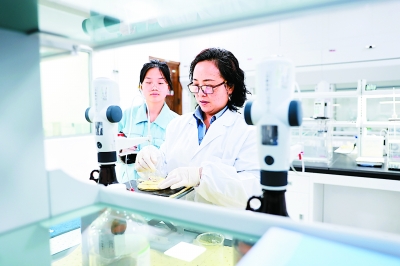 国庆假期,湖南石化干部员工坚守岗位,确保60多套装置安稳运行。其中,全球单套产能最大的己内酰胺生产研发基地保持满负荷生产,日产己内酰胺等产品逾1万吨。图为10月1日分析检验中心员工进行产品质量分析。本报记者 彭 展 摄