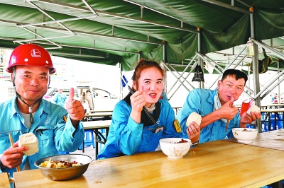 国庆长假期间,镇海基地有近2万名建设者奋战在项目施工现场。为感谢建设者的辛勤坚守,镇海炼化将满满的关爱和温暖送到建设者的心坎上。一碗红烧肉,暖暖奋斗情。 何 雯 摄