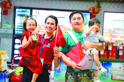 国庆假期,云南文山石油七花加能站迎来车流高峰,加油员陈明玉一直坚守岗位,为南来北往的车主提供热情服务。夜间,陈明玉的丈夫带着两个可爱的宝宝来到站上,为她加油打气。 蔡艳玲 摄 代泽万 文