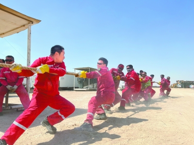 9月29日,在科威特施工的华北石油工程公司SP936钻井队利用工余时间,举行了拔河、棋类等节日活动。热闹的拔河比赛吸引了不少中外员工参与,现场气氛热烈,欢声笑语不断。王亚楠 摄 王 军 文