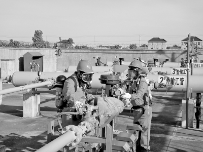 供暖季即将来临,江苏油田采油一厂盐城集气站加大天然气保供力度,详细制定管线冻堵应急预案,确保外输天然气符合质量要求。目前该站日均输气13万立方米,满足盐城市居民天然气所需。图为11月4日该站员工更换天然气外输区调压撬阀杆。赵海燕 摄 高 健 文