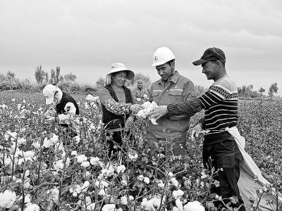 近日,在新疆施工作业的华北石油工程西部分公司90152HB钻井队接到驻地库车县盖孜库木乡村民求助,希望在寒潮来临前帮助他们抢摘棉花。图为11月7日,90152HB钻井队组织数名党员帮助村民采摘棉花。 张 均 摄