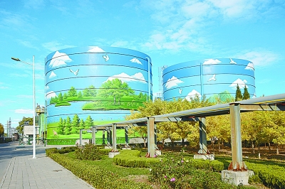 沧州炼化今年对装置区内两个消防水罐、两个烟囱进行彩绘装扮,让原本单调的罐体穿上了漂亮的“外衣”,既改善了厂区环境面貌,增添了诗意,又丰富了企业文化内涵,树立了良好形象。 图为完工后的彩绘消防水罐。 伏铁刚 摄 张 婷 文