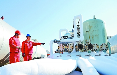 中国石化首个页岩油二氧化碳驱矿场试验——华东油气分公司江苏兴化鲁1井组二氧化碳驱提高采收率矿场试验,10月开始注入二氧化碳,至目前已超万吨,为周边页岩油井地层补充能量,深入探索页岩油二氧化碳驱提高采收率的可行性。图为近日华东油气分公司员工在鲁1井组现场巡检。 本报记者 沈志军 摄 刘方志 金 华 张龙强 文
