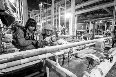 12月9日至10日,西北油田塔河油田遭遇今冬首场大雪。采油三厂迅速行动,各部门紧密结合生产实际,加密站库巡检频次,排查生产隐患,做好设备监测,优化装置运行,最大程度减轻寒潮影响,确保油气生产安全平稳。图为三号轻烃站值班员工检查外输压缩机运行状况。石立斌 摄