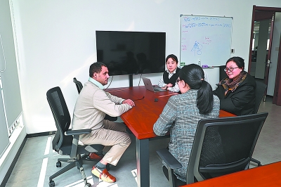 1月21日,本报记者岳彩凤(右一)、王莹(右三)在南京工程公司沙特SABTANK AMIRAL项目部采访沙特基础工业公司该项目负责人萨拉·阿卜杜勒·阿尔加姆迪。李 舒 摄