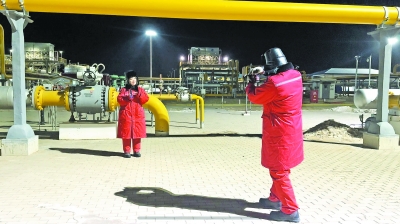 2月7日晚,内蒙古鄂尔多斯气温降至零下27摄氏度,本报记者洪晨曦(左)和单路(右)在华北油气分公司东胜气田集中处理站采访,了解华北地区天然气供应情况。 姚 冬 摄