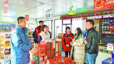 1月30日,本报记者郝春炜(右一)、段景文(右二)在山西太原石油军民路加能站,了解易捷便利店假期增值服务细节。秦晓耕 摄