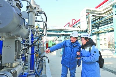 1月17日,本报记者张炅(右)在燕山石化化学品厂2号氢气新能源装置现场采访。张明慧 摄