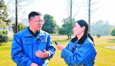 1月20日,金陵石化记者站记者张霄敏(右)在金陵石化烷基苯厂,采访中国科学院中微子液体闪烁体科研团队成员刘冬。罗 涛 摄
