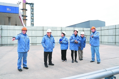 ?1月24日,本报记者蔡廷永(左二)、张欢(左三)、马玲(左四)、黄嫣然(左五)在青岛炼化海水制氢装置前采访青岛炼化发展规划高级专家梁峰(右一)。 刘 强 摄