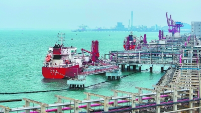 今年以来,中科炼化紧跟市场动态,统筹安排生产和销售计划,强化两个厂区物料互供,优化调整产品结构,全力增效创效,1月芳烃、异辛烷、环氧乙烷等高附加值产品产量同比明显增长。图为近日该公司二甲苯通过船运出厂。 林江海 摄 吴金梅 文